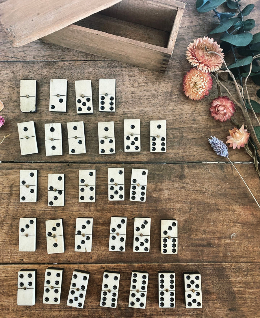 Ancien jeu de Dominos complet, composé de 28 pièces en bois d’Ebène et en os absolument imparfait mais tellement charmant !