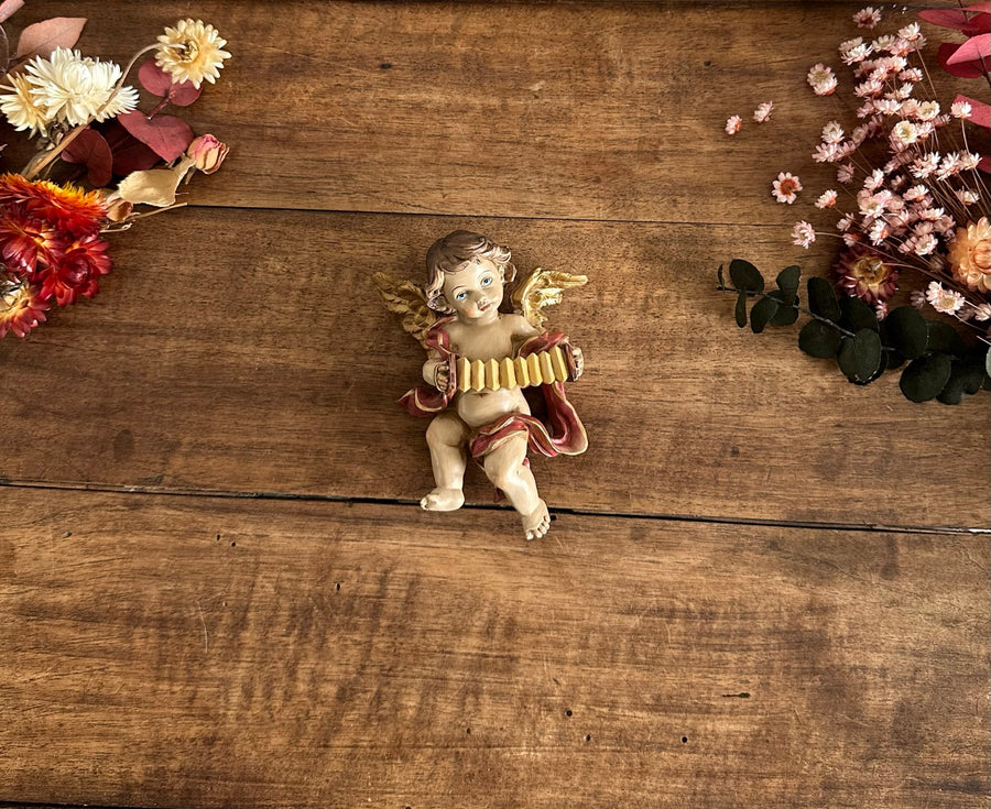 Adorable petit chérubin angelot en plâtre, accompagné de son accordéon. Petit objet imparfait ayant vécu. Estimation années 60; Attache récente.