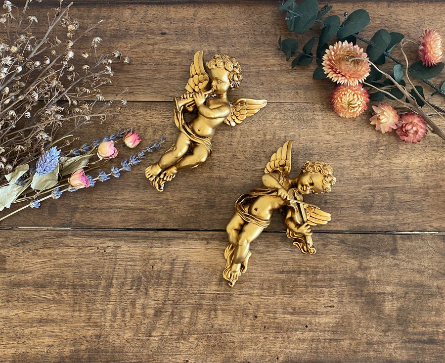 Jolis petits chérubins dorés années 60 en plâtre à accrocher au mur ou à poser sur un meuble.