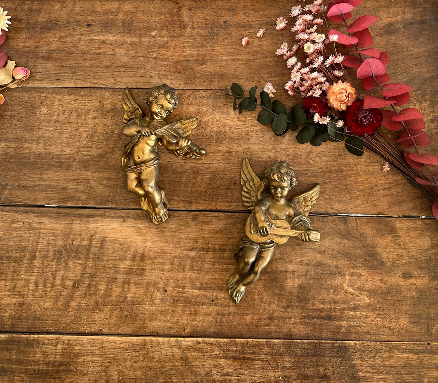Jolis petits angelots musiciens en plâtre peint en doré. Vendus séparément.
