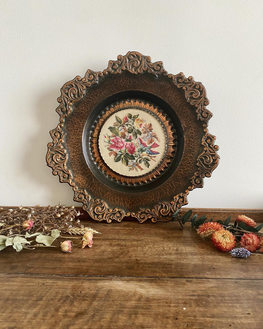 Ravisante assiette décorative en cuivre à suspendre, avec ses jolis reliefs mordorés encadrant une délicate broderie faite main. Produit très original !