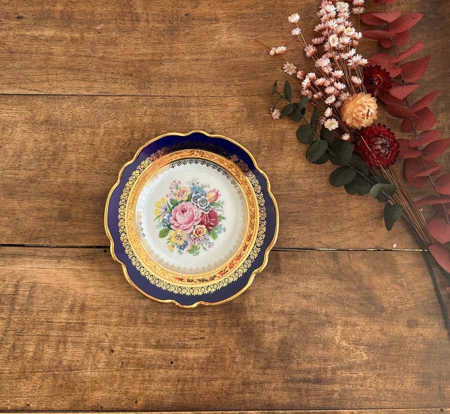 Ravissante petite assiette décorative dotée d'une jolie frise bleue nuit et or et de délicates fleurs en son centre, réhaussé main. Fera un joli vide poche.