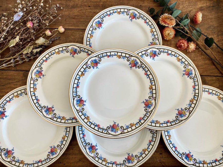 olies Assiettes à dessert fleurs en porcelaine de Limoges avec leurs frises noires art déco. Il y en a 10 et elles sont datées d’à partir des années 40 selon l"estampille.
