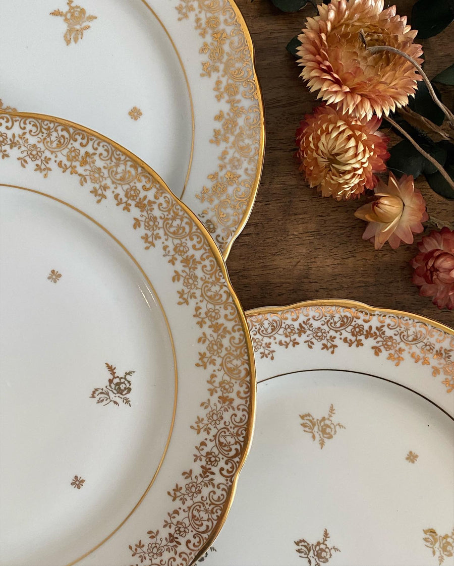 Lot de 11 jolies assiettes à dessert blanches et or en porcelaine avec leur frise dorée. non signées.