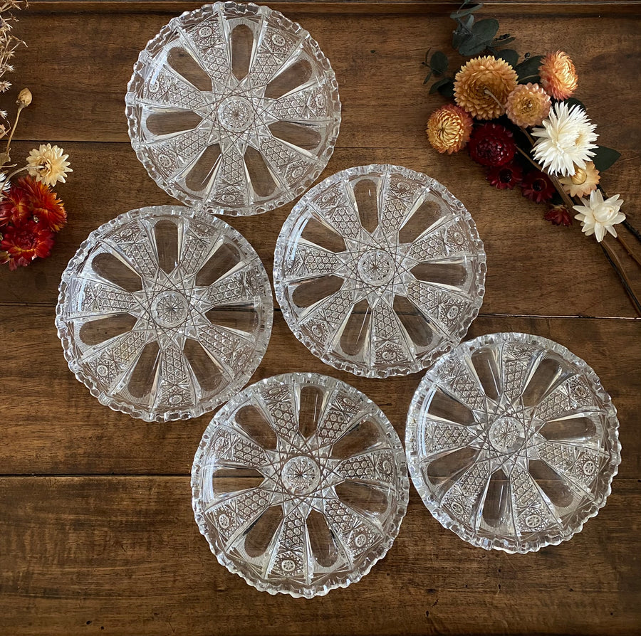 Sublime ensemble de 5 petites assiettes / coupelles en cristal ciselé. Pourront être utilisées commes petites assiettes à pain ou apéro, vide poches ou en déco pour illuminer vos tables. Vendues ensemble