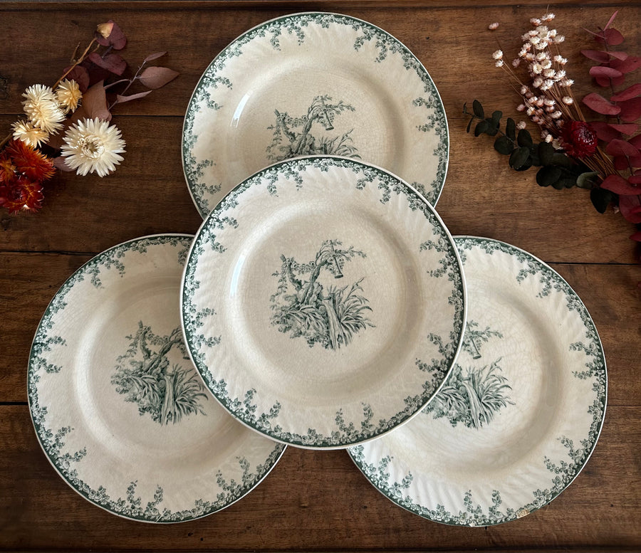 Coup de coeur pour ces quatre belles assiettes en porcelaine opaque de la manufacture Gien. Terre de fer. Modèle Virgile. Estimation 1886 - 1938. A noter, ces assiettes sont très anciennes et disposent d'évidentes traces du temps visibles sur les photos. Vendues à l'unité