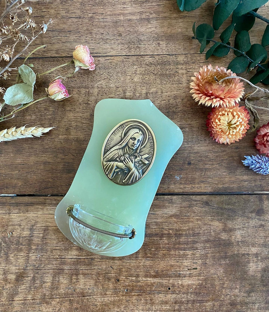 Petit bénitier en verre sur son support en pierre avec au centre un médaillon de Sainte Thérèse de l’enfant Jésus en laiton. Un anneau au dos permet de l’accrocher.
