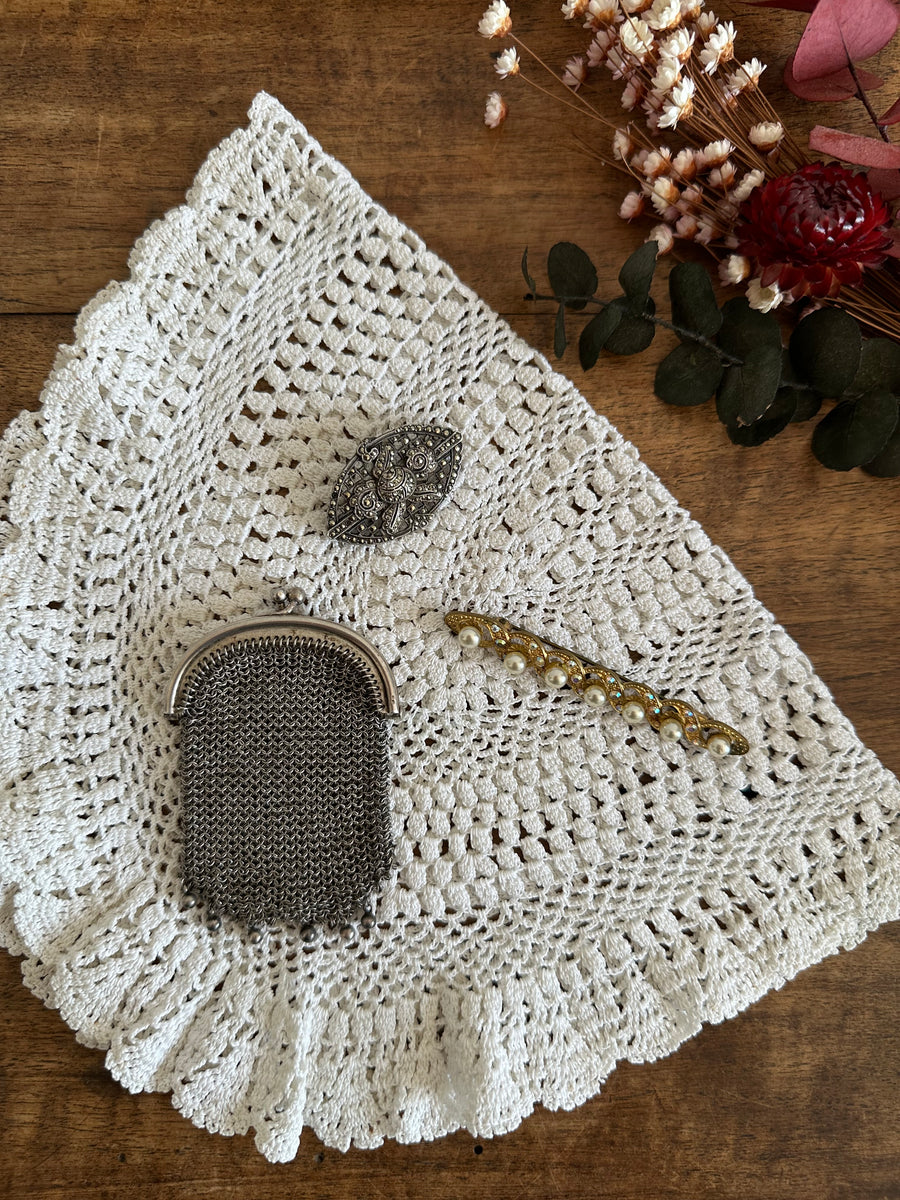 Ravissant duo de petits accessoires et bijoux anciens du début XXème. A noter, un petit brillant manque sur la broche argentée cf photos. Cela n'altère en rien sa beauté.