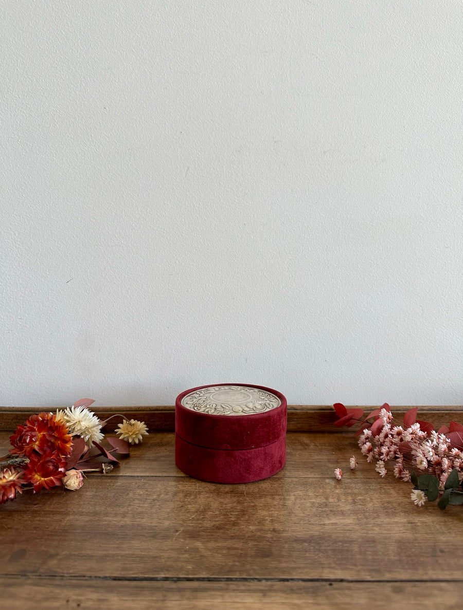 Ravissante petite boite à bijoux ronde recouverte de velours couleurs grenat. On aime particulièrement les détails sculptés sur son couvercle en argent 925. Fabrication italienne. Estimation années 80
