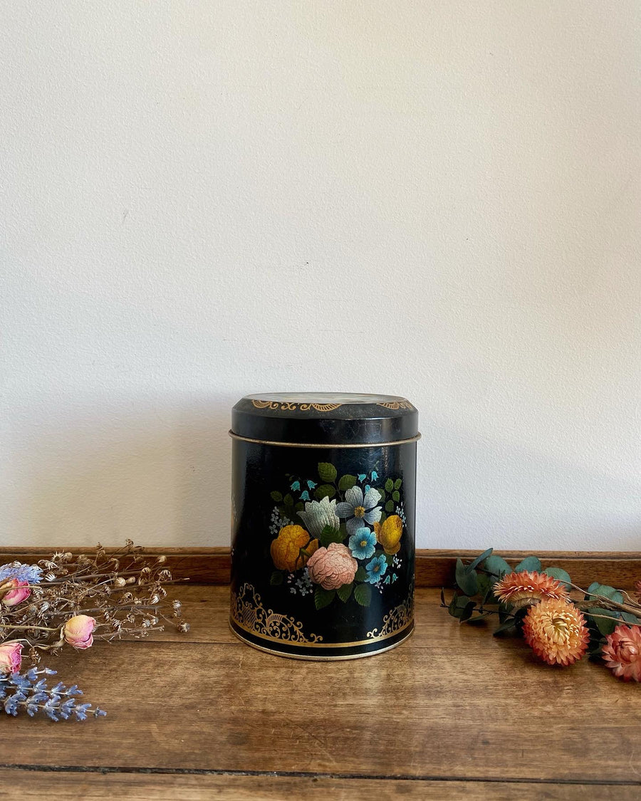 Élégante boite en fer ancienne avec ses motifs à fleurs et frises dorées. Impression peinture craquelée. Elle présente quelques signes du temps mais sera parfaite en décoration de cuisine par exemple !