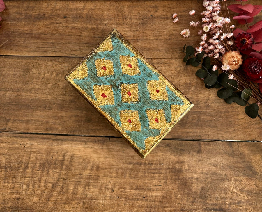 Jolie petite boite à bijoux en boite style florentin. On aime ses tons bleus et or lumineux.