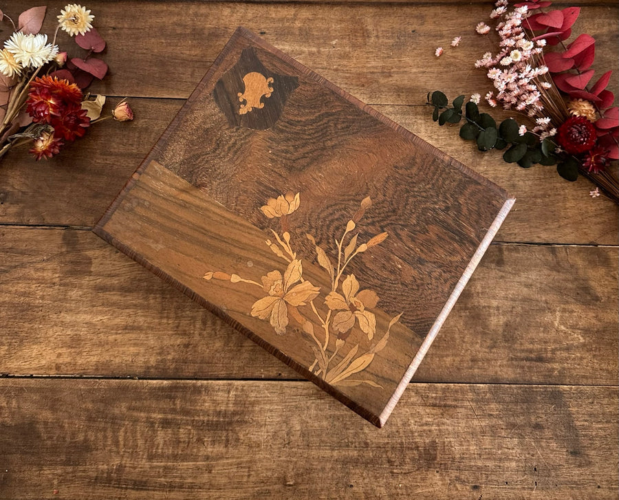 Ravissante boite en bois estimée années 1900. Ancienne boite d'aquarelliste, elle dispose toujours de sa petite planche intérieure et de sa belle marqueterie ornée de fleurs. A noter, pièce ancienne qui présente un léger jeu au niveau des charnières ce qui ne l'empêche pas de fermer parfaitement.