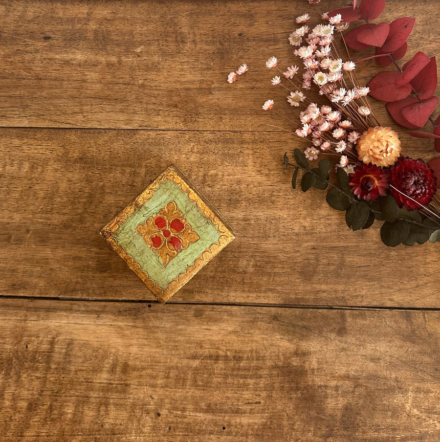 Charmante petite boite en bois, décoration style florentin. De jolies traces du temps à l'intérieur et à l'extérieur.