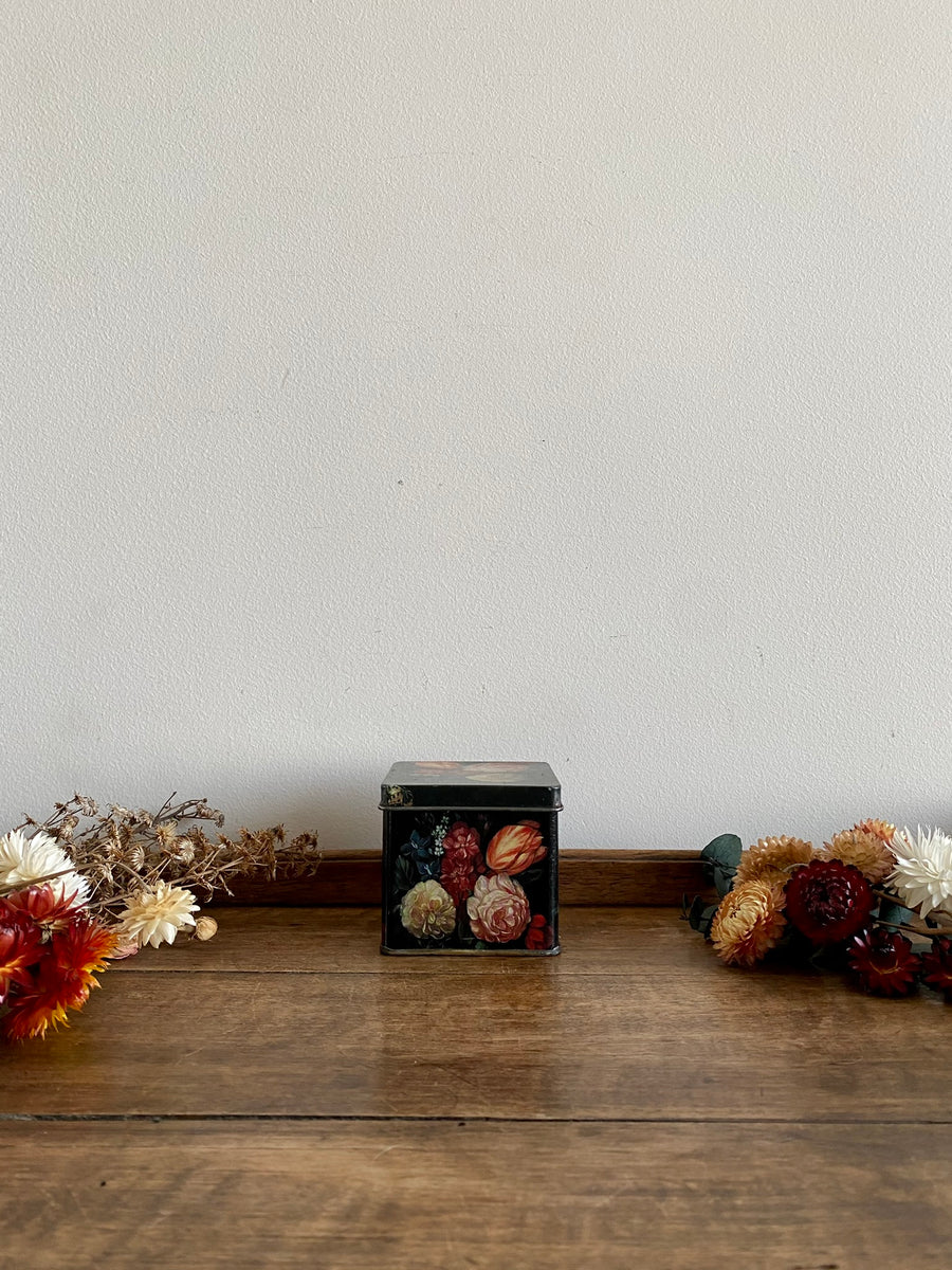 Jolie petite boite carrée en fer effet craquelé décorée de fleurs roses.
