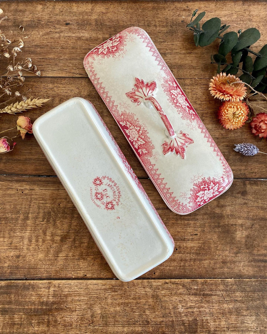 Jolie boîte en porcelaine Sarreguemines Collection « jardinière » très ancienne. Utilisée jadis pour y ranger une brosse à dents.