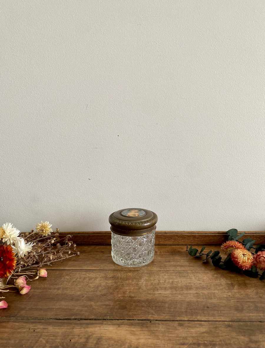 Ravissante petite boite en verre taillé et son couvercle en métal décoré du portrait d"une jeune fille au chapeau.
