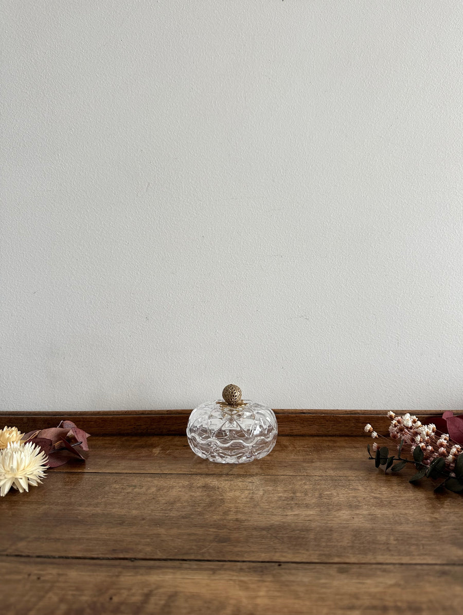Ravissante petite bonbonnière en cristal moulé sertie d'un petit ornement en laiton ajouré. Estimation années 70. A noter : Un discret manque au niveau de l'ornement qui n'altère en rien son utilisation.