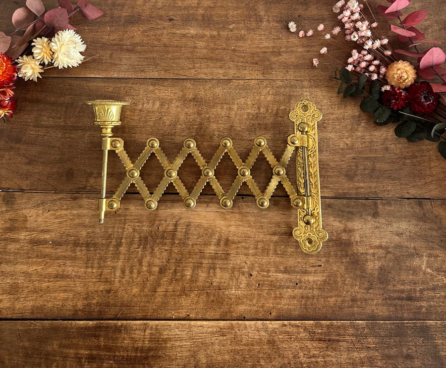 Joli bougeoir de piano dépliant en accordéon. Estimation fin XIXème début XXème. Bel objet patiné, on aime le travail de ciselures sur le laiton. On les trouvait autrefois sur les pianos pour éclairer les partitions et les touches.