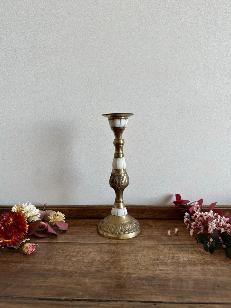 Ravissant bougeoir en laiton travaillé et facettes nacrées, on adore ses courbes orientales et sa jolie patine.