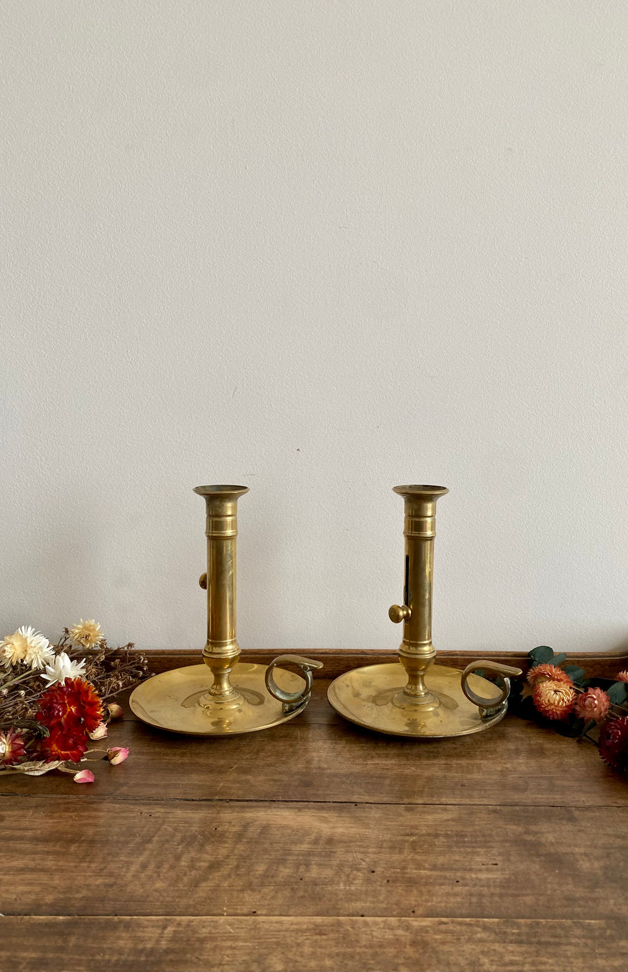 Joli duo de bougeoirs en laiton doré, dotés de boutons pressoirs et de bague de doigts.