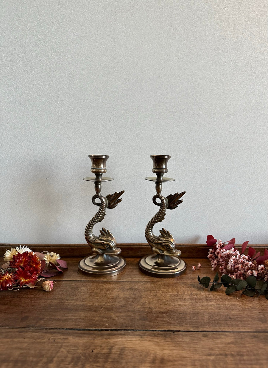 Bougeoirs en bronze doré dauphins dragons
