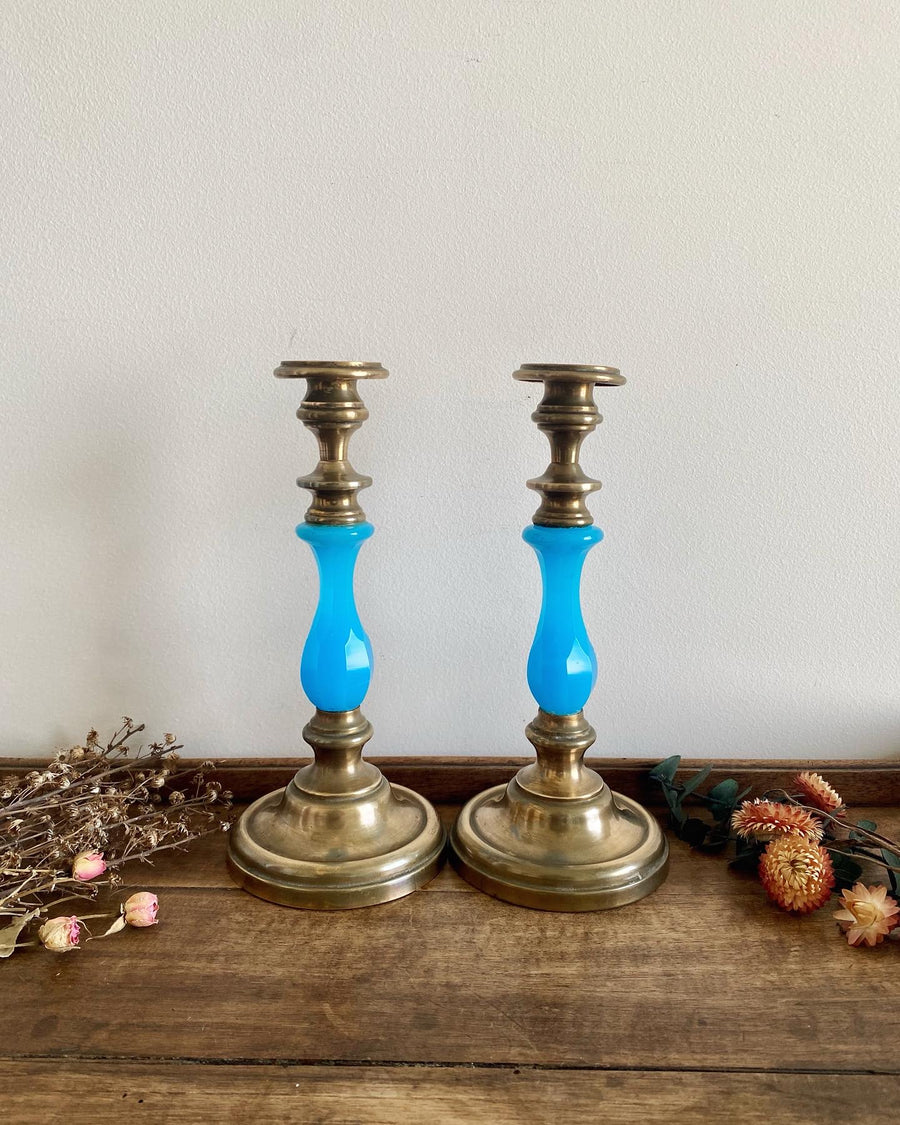 Bougeoirs en laiton avec leur élégant manche bleu en opaline