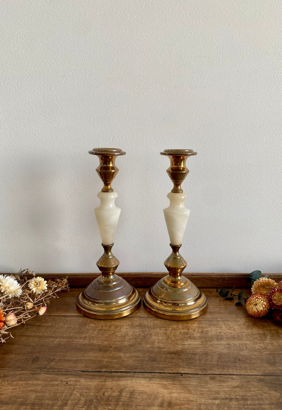Beau duo de bougeoirs anciens, beau mélange du laiton cuivré et de l'albâtre. Dans leurs jus, celui de gauche sur la première photo est légèrement plus oxydé que l'autre, on adore leur belle patine.