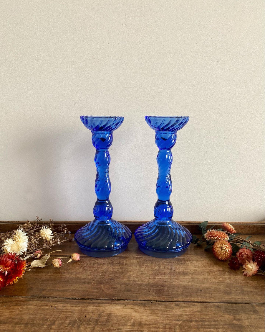 Elégant duo de bougeoirs en verre bleu électrique torsadés à base large