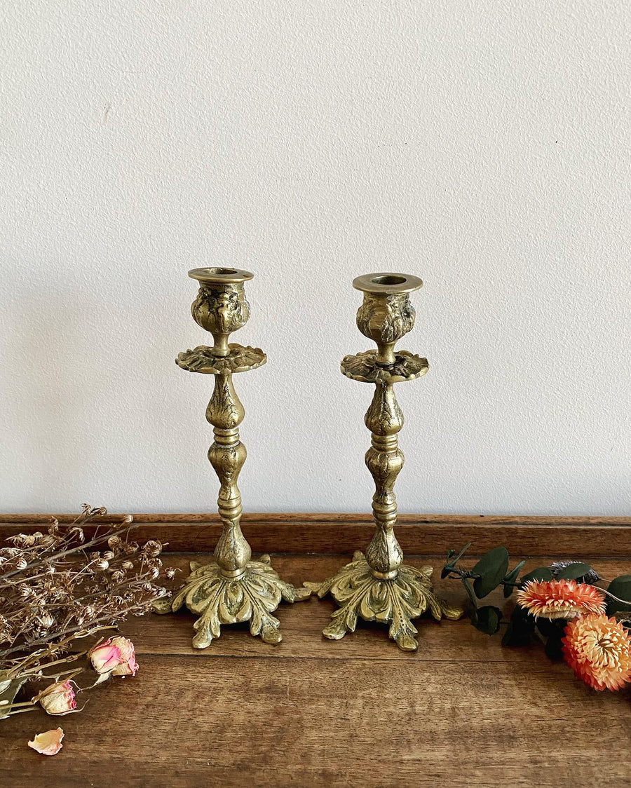 Paire de bougeoirs très anciens sur leurs pieds sculptés en forme de feuilles qui apporteront charme élégance dans votre intérieur