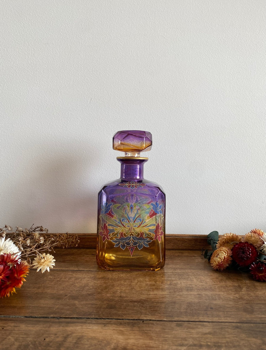 Jolie bouteille en verre aux belles couleurs mauves et oranges. Sera parfaite en accompagnement sur un mini bar !