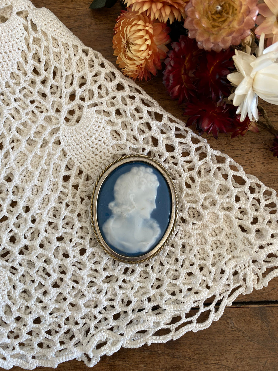 Ancienne broche camée en porcelaine bleue. Dans son jus et si jolie !