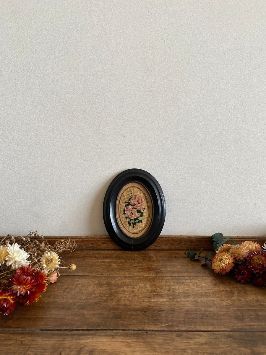Joli petite broderie très ancienne dotée d'un cadre en bois noir et d'une marie louise en papier d'époque. À noter des traces du temps attendues pour un objet si ancien. Estimation début XXème.
