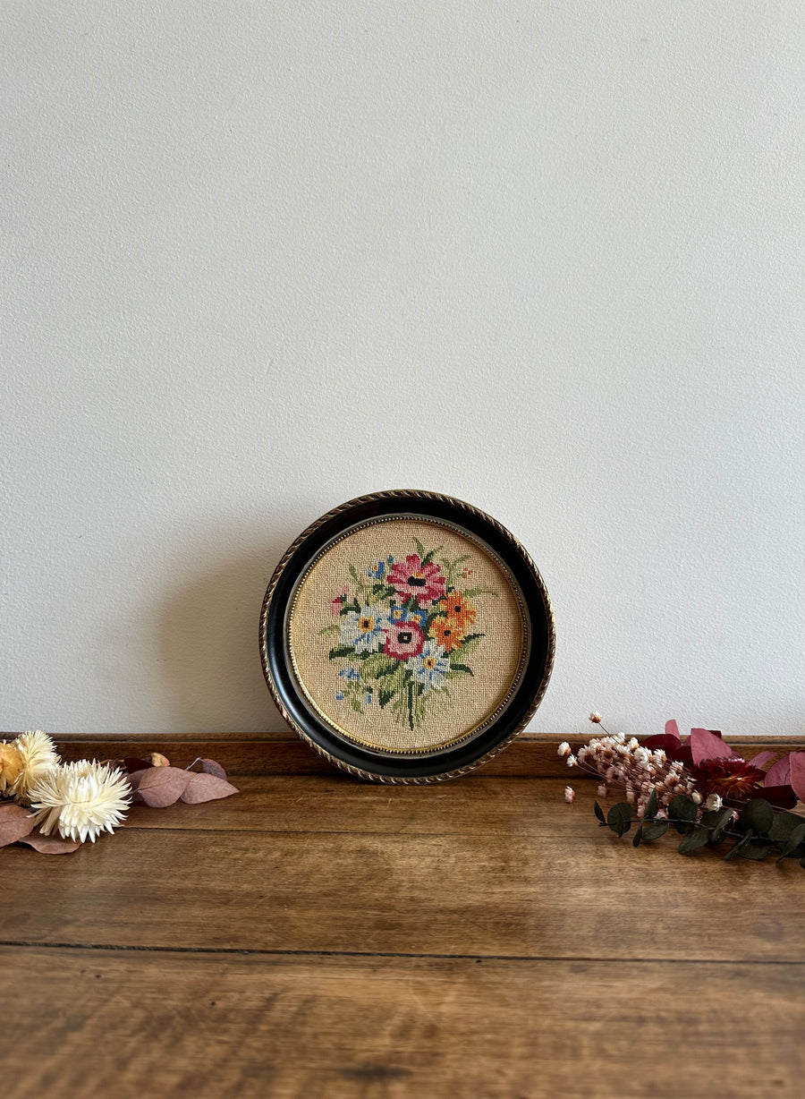 Jolie petite broderie ronde cerclée d'une bordure gris foncé. Bouquet de fleurs printanier au point de croix. Estimation années 50-60