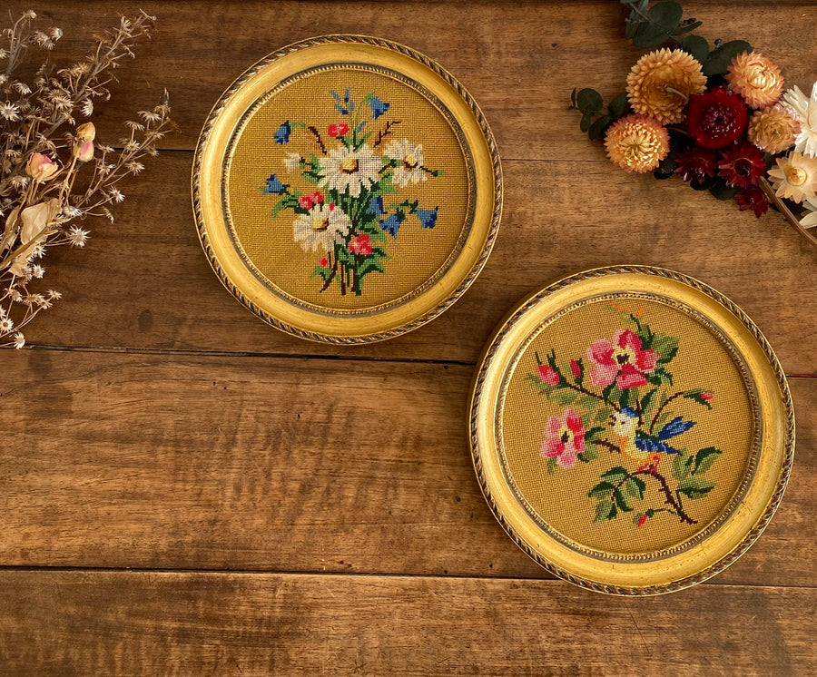Ravissant duo de broderies faites main dans leurs cadres ronds aux tons dorés. Vendues séparément.