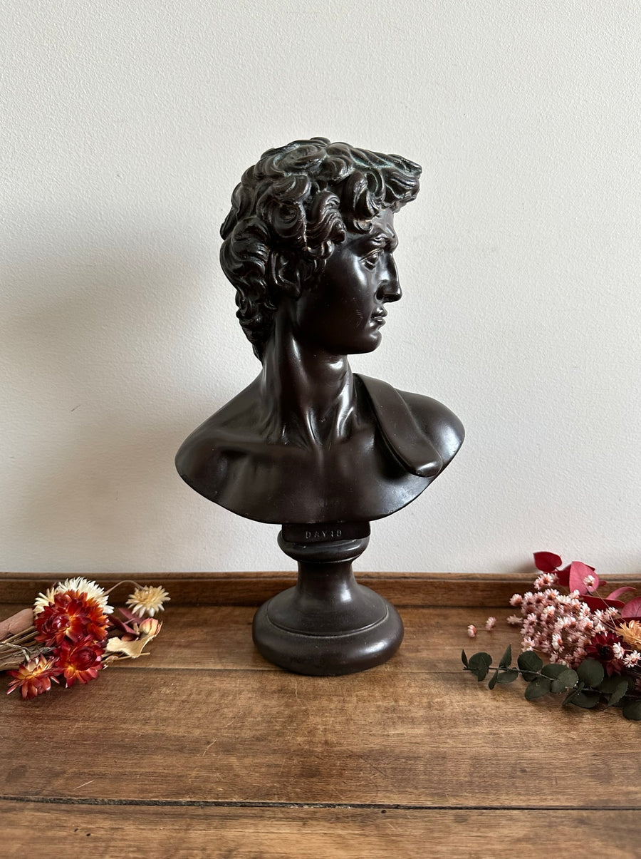 Coup de coeur pour ce beau buste de David en plâtre peint. On aime l'effet dramatique qui s'en dégage. Estimation années 90.