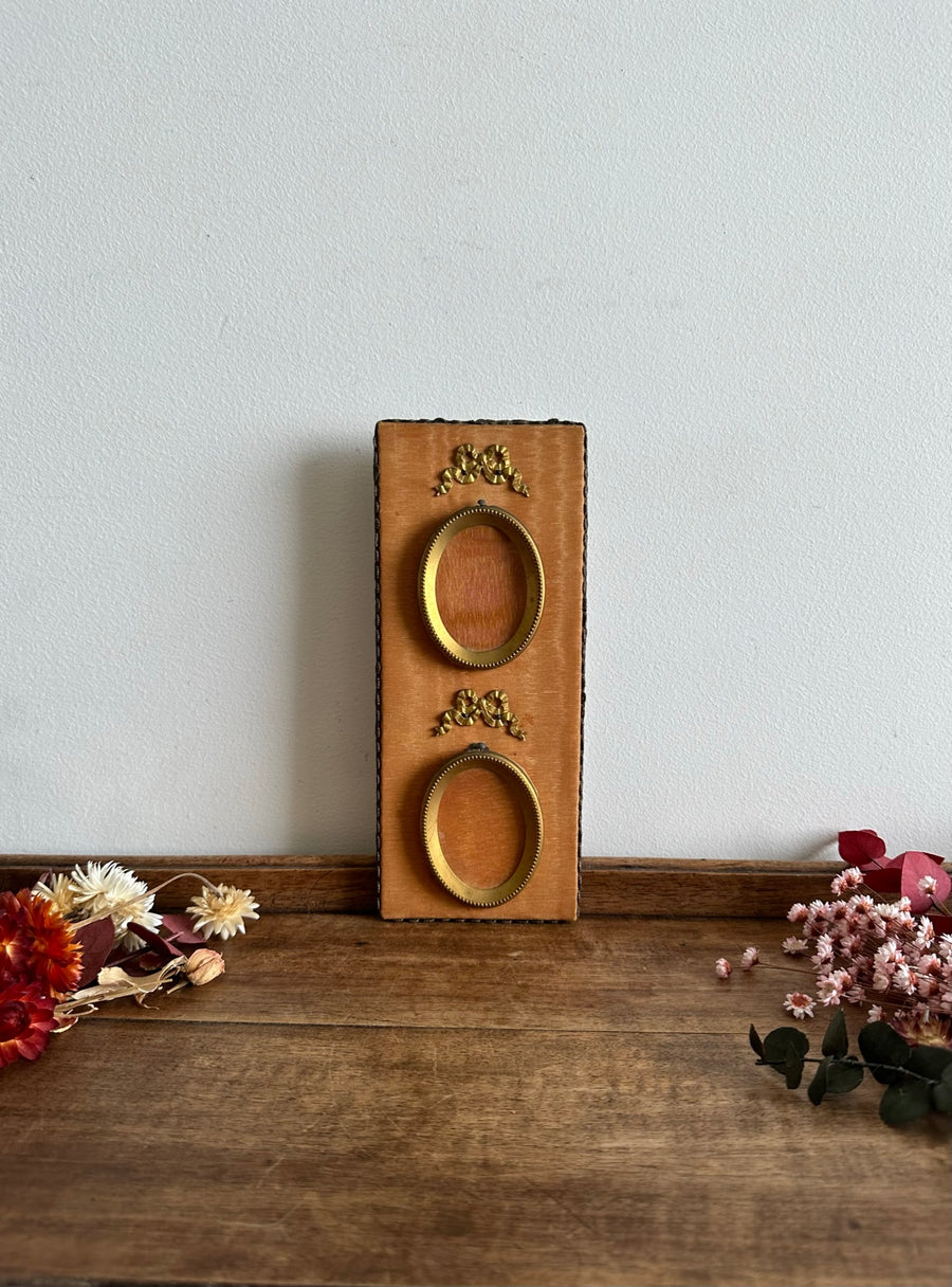 Charmant cadre mural recouvert de tissu orangé, avec ses deux petits médaillons cerclés. Chaque médaillon se détache individuellement. Style napoléon III, estimation années 50.