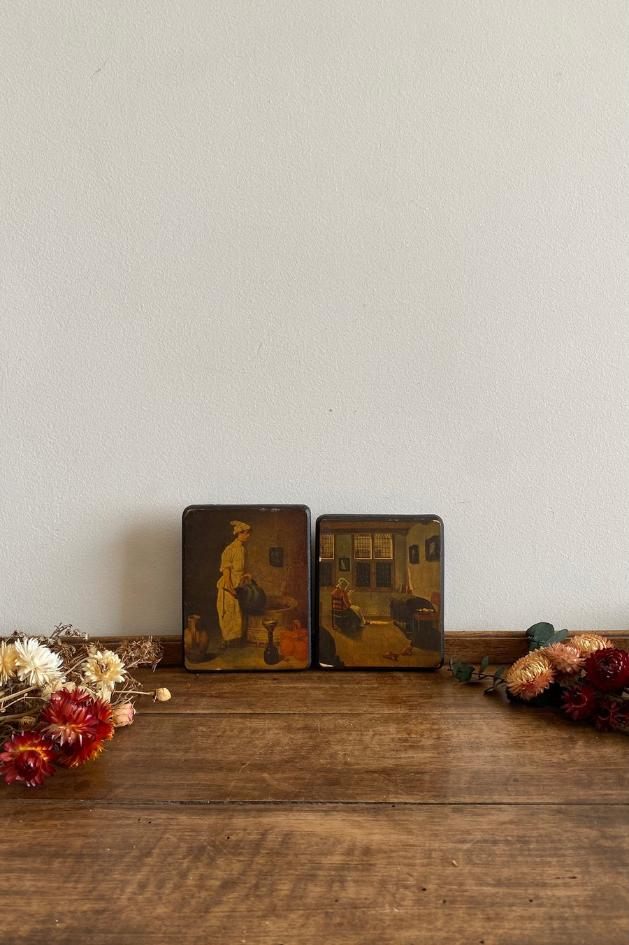 Duo de deux petites images pressées sur bois. Pieter Janssens Elinga, Femme lisant et artisan au travail. Vendus séparément.