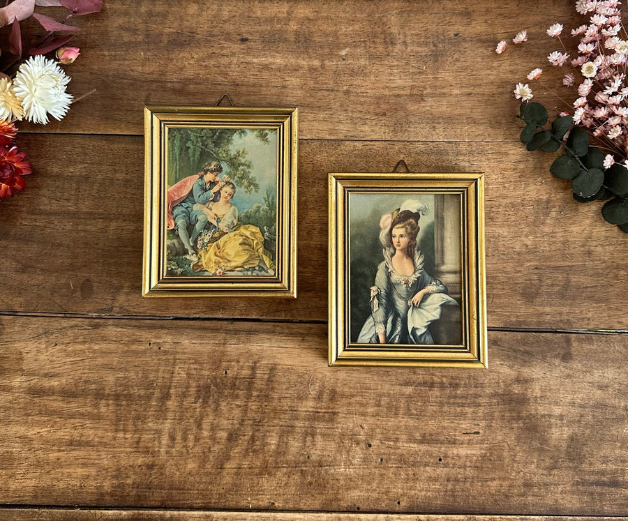 Joli duo d'impressions sur tissu encadrées. Cadres en bois. Estimation années 60.