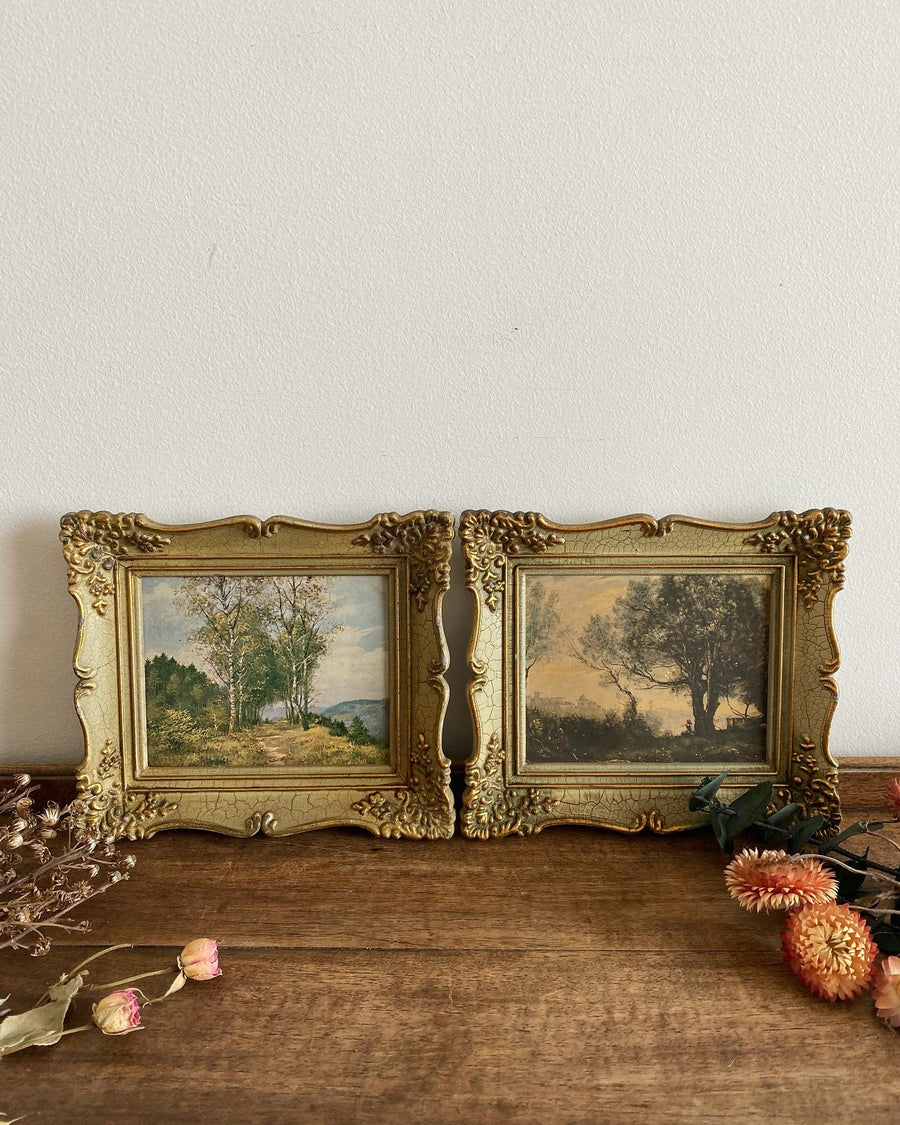 Lot de deux cadres originaux en plastique gris vert clair et doré façon bois peint craquelé et leurs images représentant de jolis paysages de campagne.