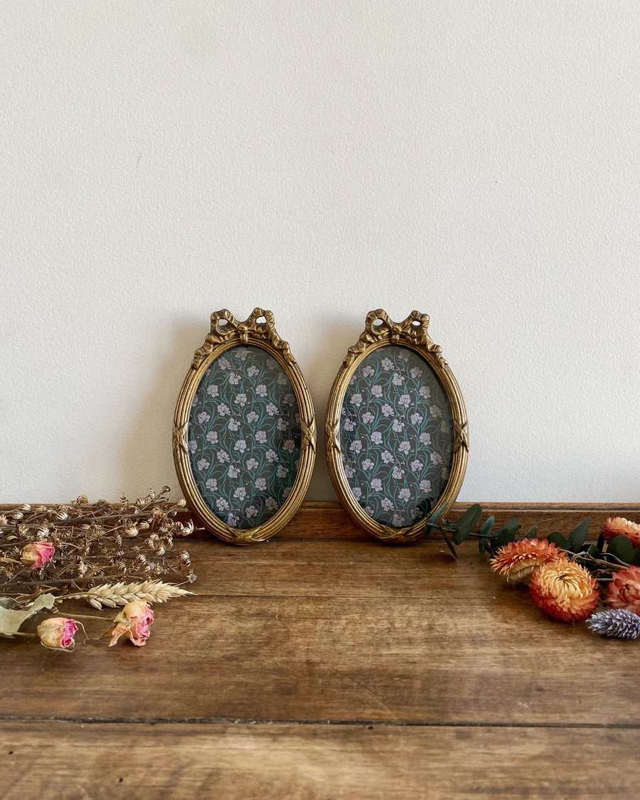 Duo de deux ravissants petits cadres photos en bois doré de forme ovale avec leur nœud rubané style Louis XVI.