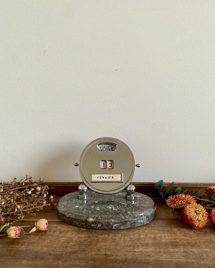 Cette semaine, nous vous présentons ce petit calendrier perpétuel avec sa base porte plume en marbre gris foncé.