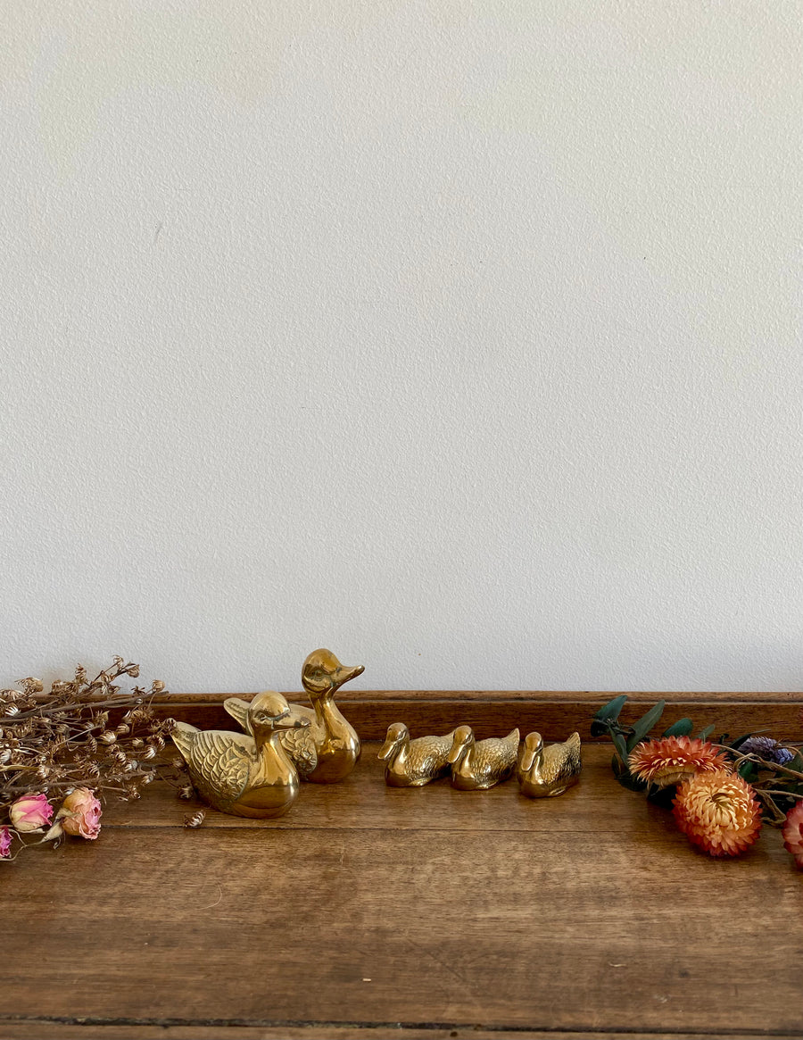 Petite famille de canards en laiton vintage, la maman et le papa et leurs 3 canetons en balade
