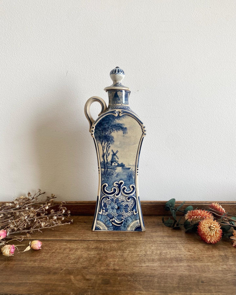 Carafe ancienne faïence de Delft, fin XVIII, peinte dans un camaïeu de bleus, représentant un moulin d'un côté et un bateau à voile de l'autre