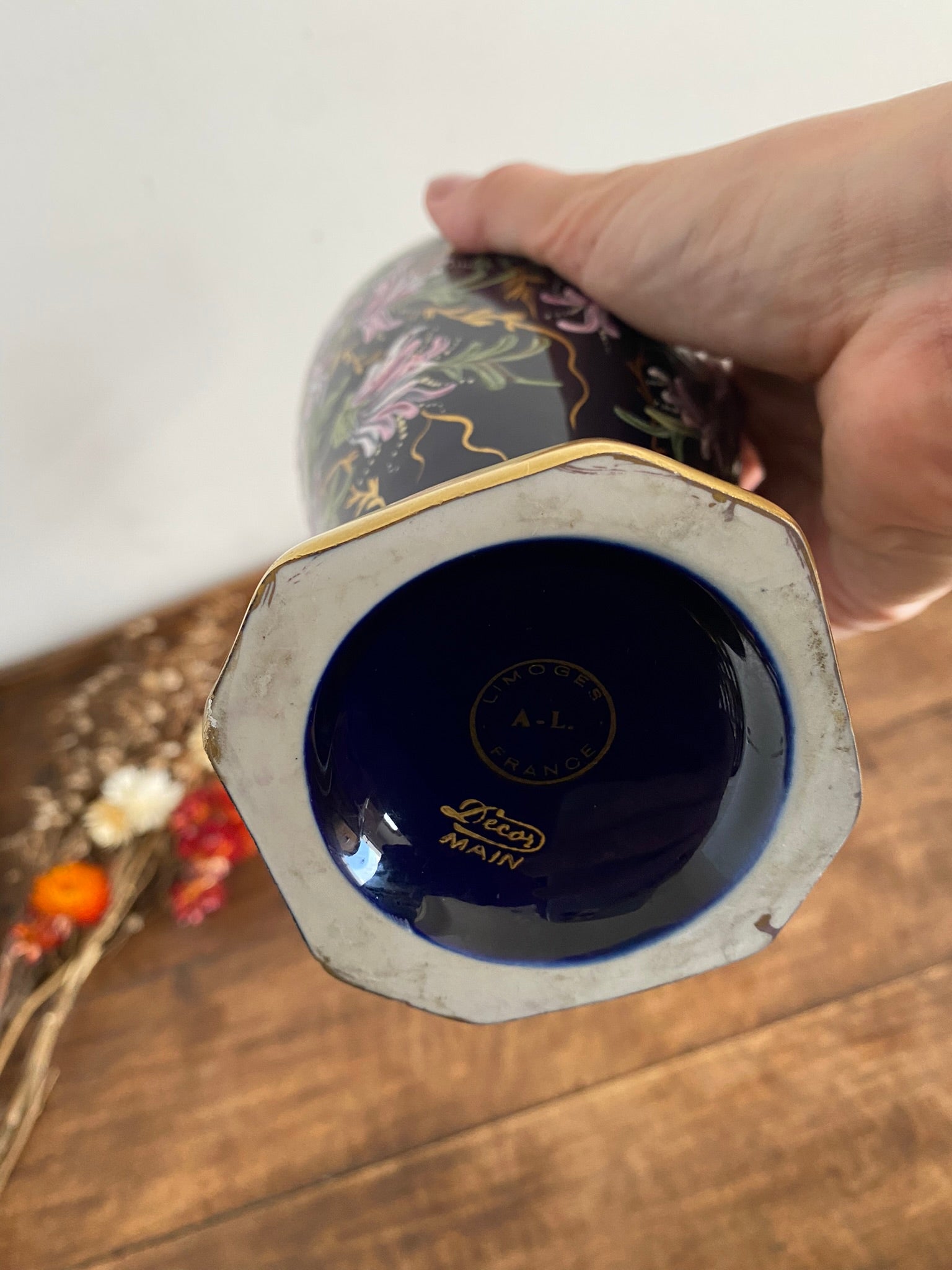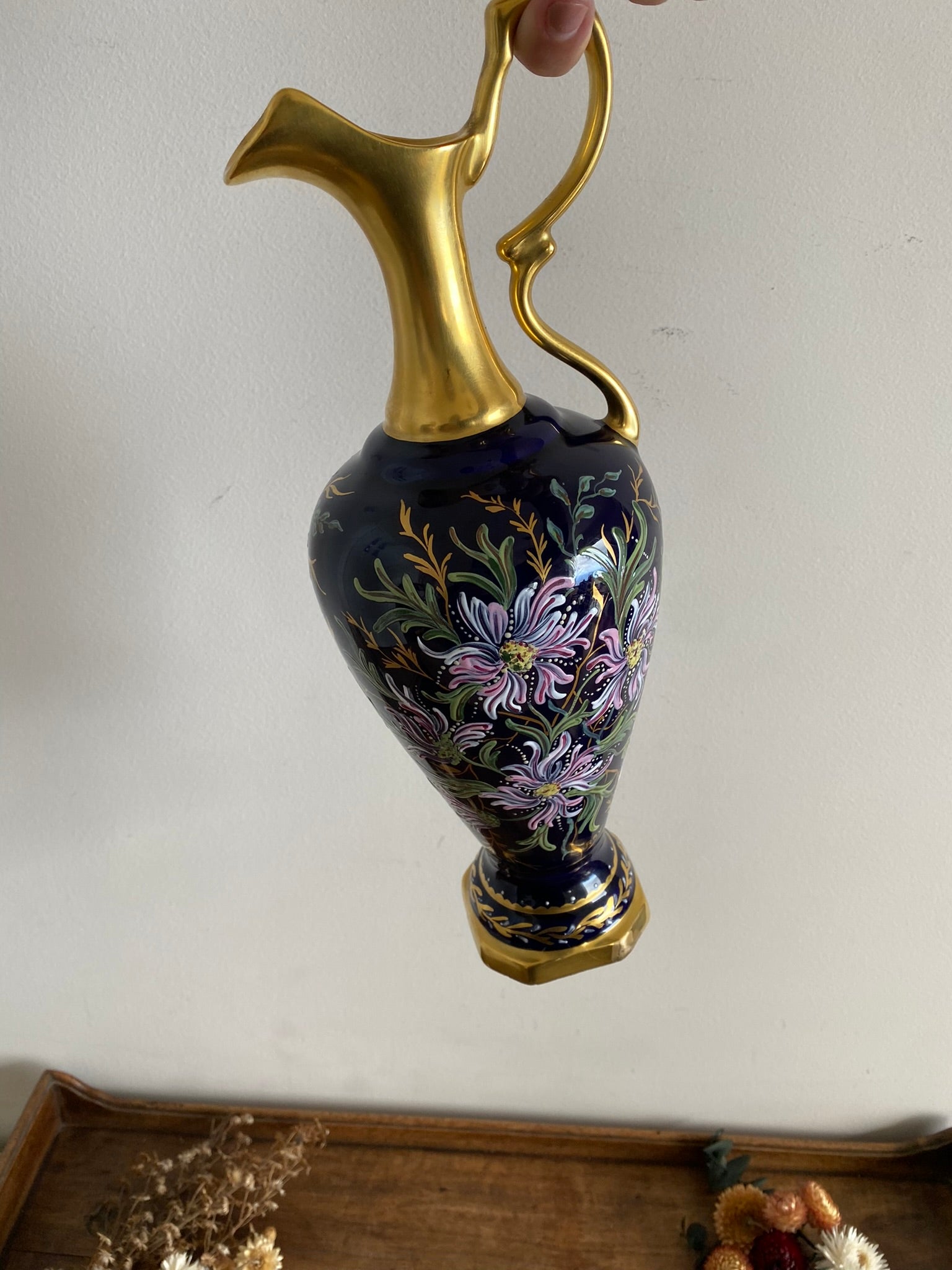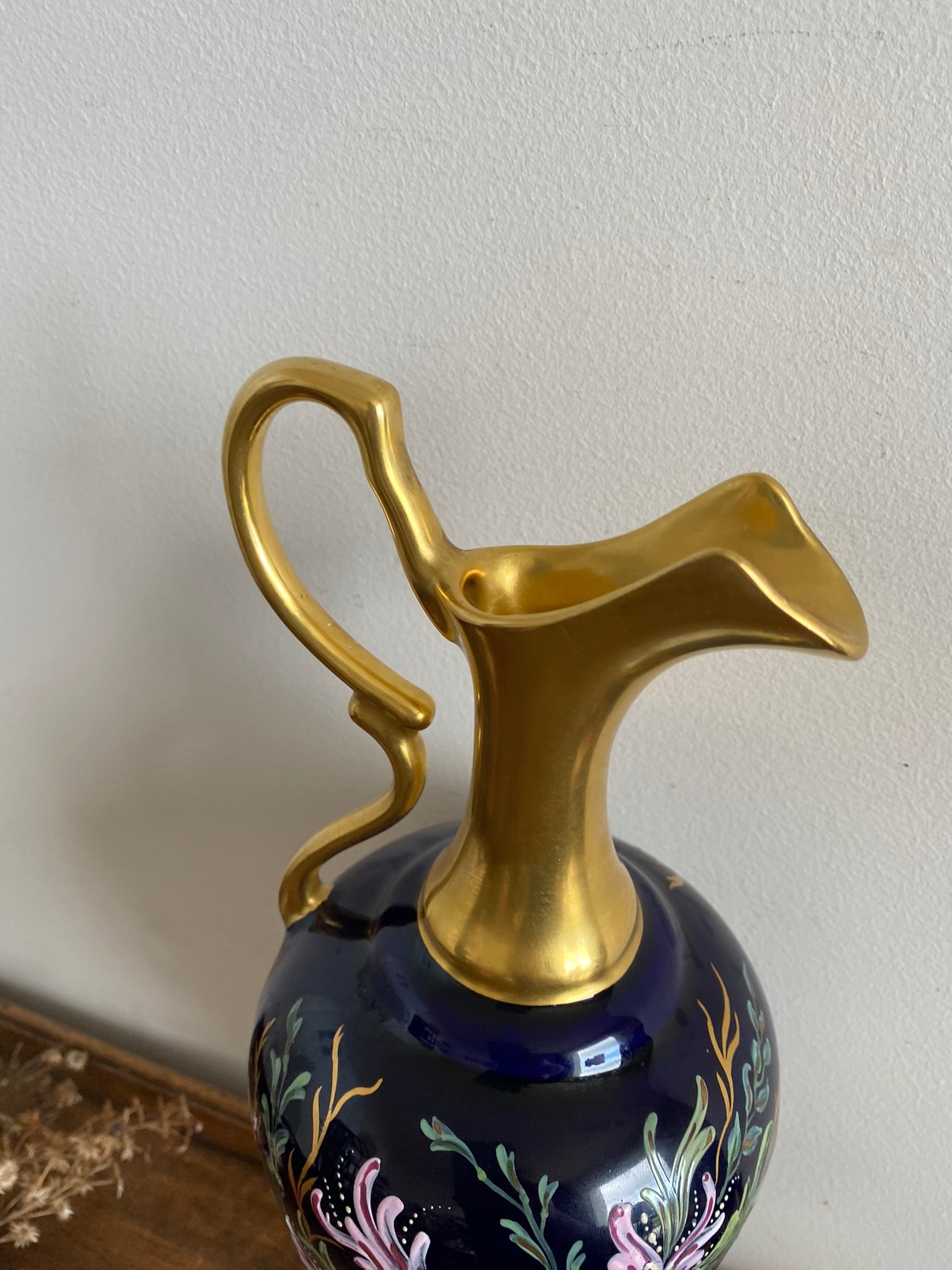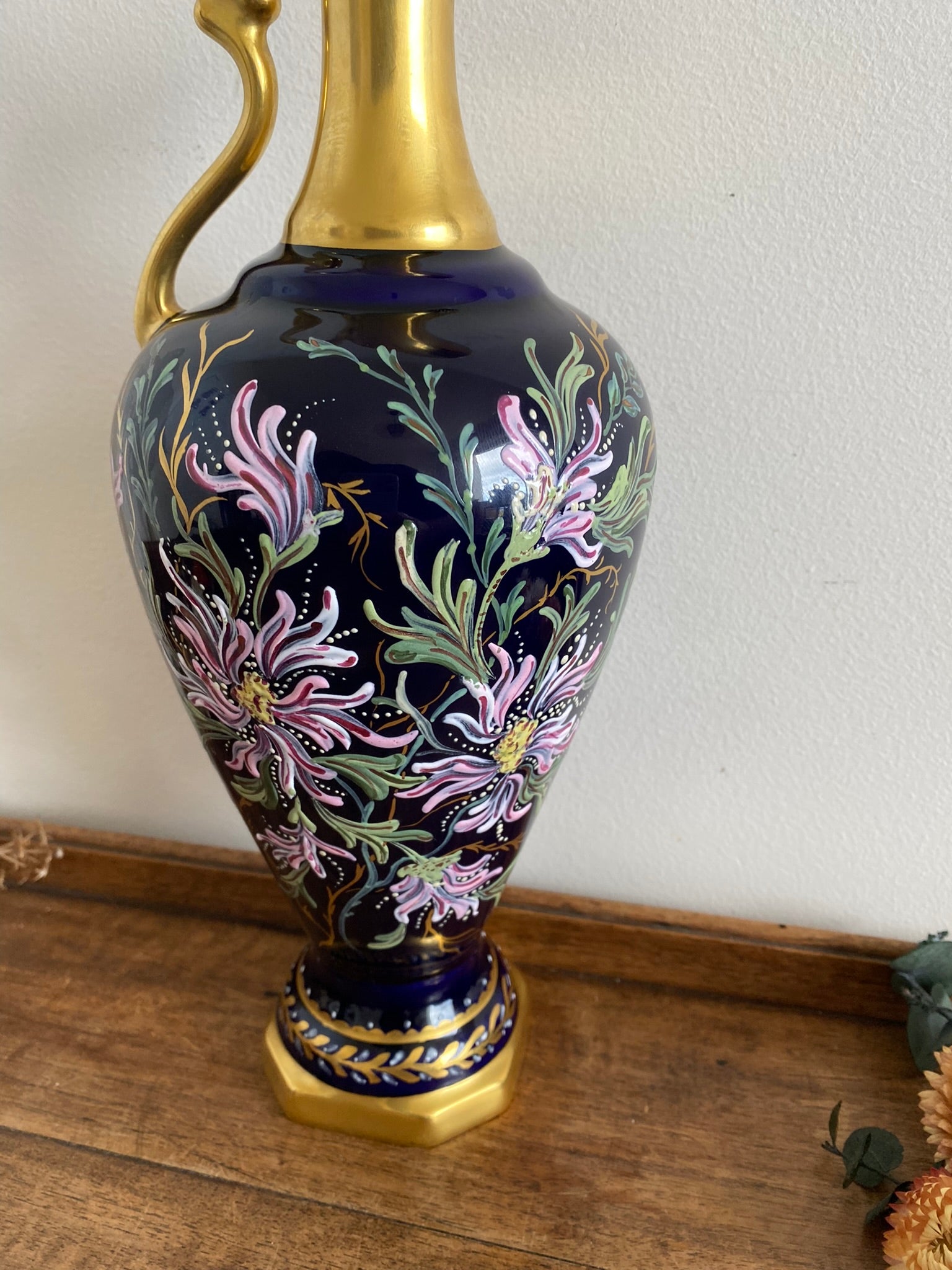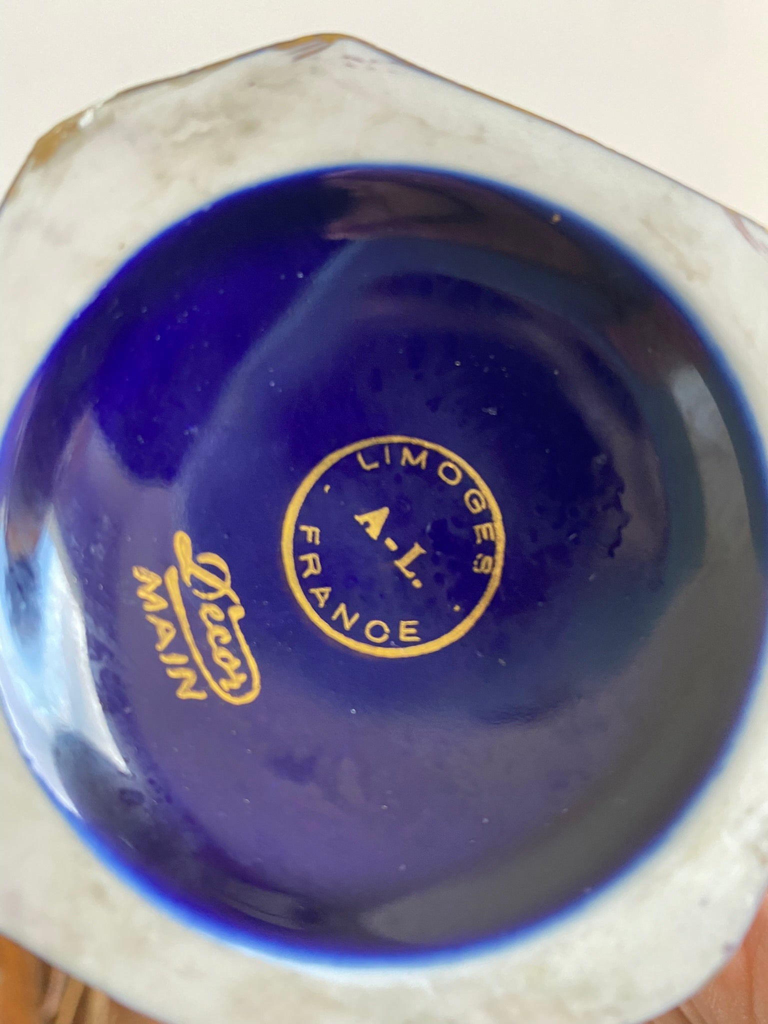 Ravissante carafe en porcelaine signée Limoges, décors main. A noter, une légère imperfection au niveau du socle visible sur les photos.