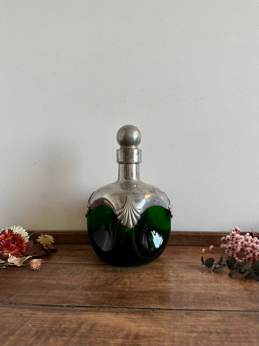 Belle carafe en verre épais et lourd. Recouverte d'étain, bouchon rond en liège.
