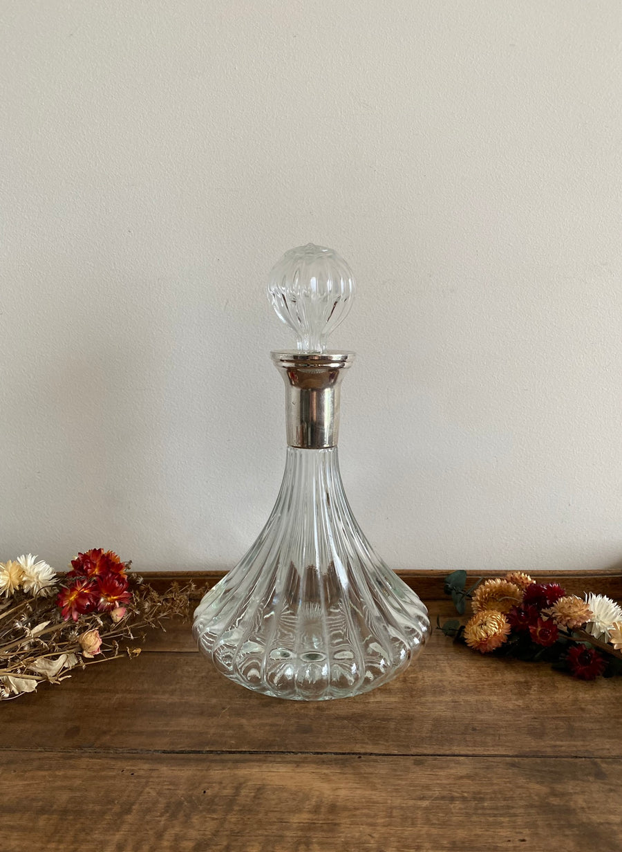 Belle carafe à décanter vintage en verre moulé et son bouchon rond. Estimation années 60.