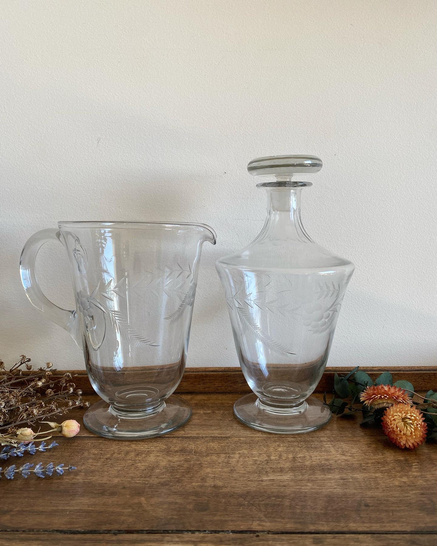 Carafe et pichet en verre travaillé assortis