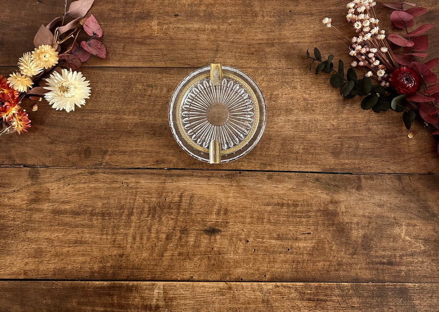 Joli petit cendrier en cristal moulé cerclé de métal doré. Estimation années 70. Quelques petites traces du temps