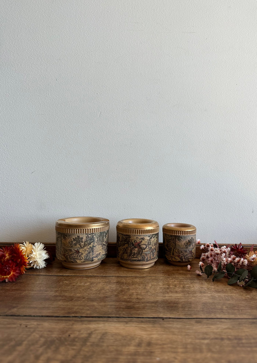 Ensemble pour fumeur composé d'un cendrier et de deux pots assortis. Scènes de chasse. Décor fait main, Fabrication Italienne. Décoro Giotto. Italy Fiorentine. Estimation années 60. Vendus ensemble.