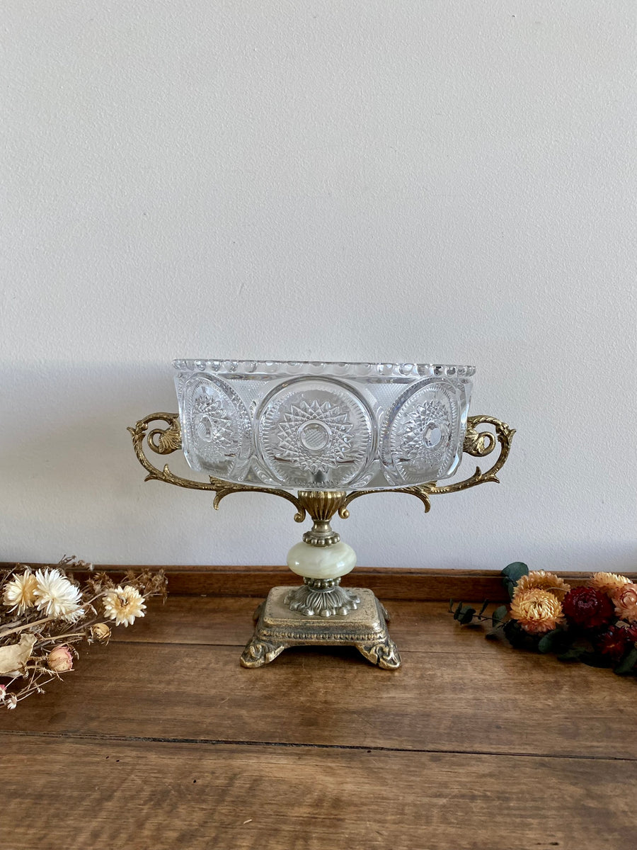 Centre de table en cristal travaillé pied métal patiné et onyx